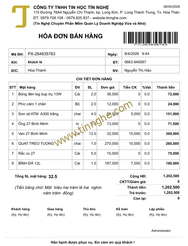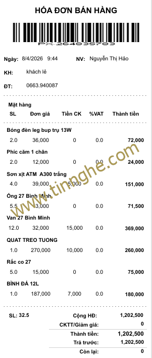 - Mẫu in, khổ in bán hàng/dịch vụ (tùy chọn nhiều khổ in 57, 80, A5, A4, A3)