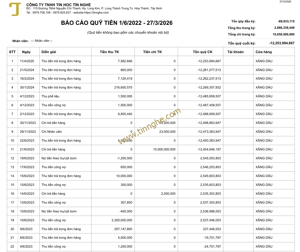 - Báo cáo tổng kết thu chi hằng ngày (tiền thu, tiền bán hàng, tiền chi, công nợ) ứng với từng cột bơm và nhân viên/ca.