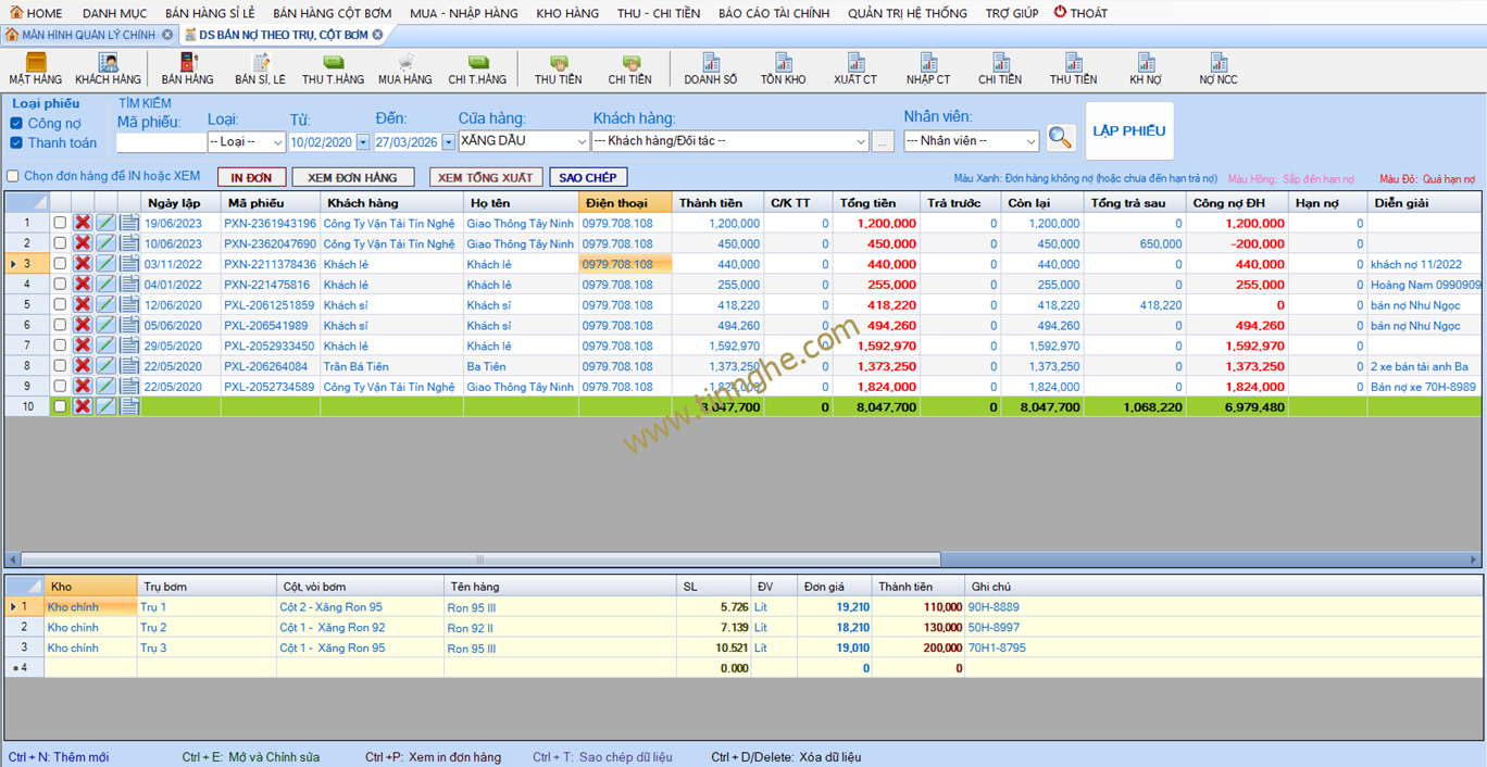 Báo cáo xuất bán nợ chi tiết theo trụ cột bơm