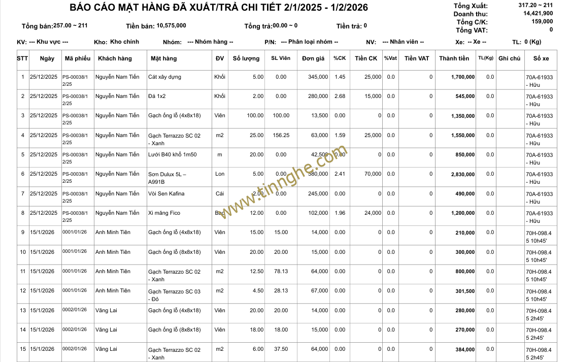- Báo cáo đơn hàng xuất/trả tổng quát, chi tiết (ngày tháng, nhóm mặt hàng, mặt hàng, khách hàng, khu vực, nhân viên kinh doanh)
