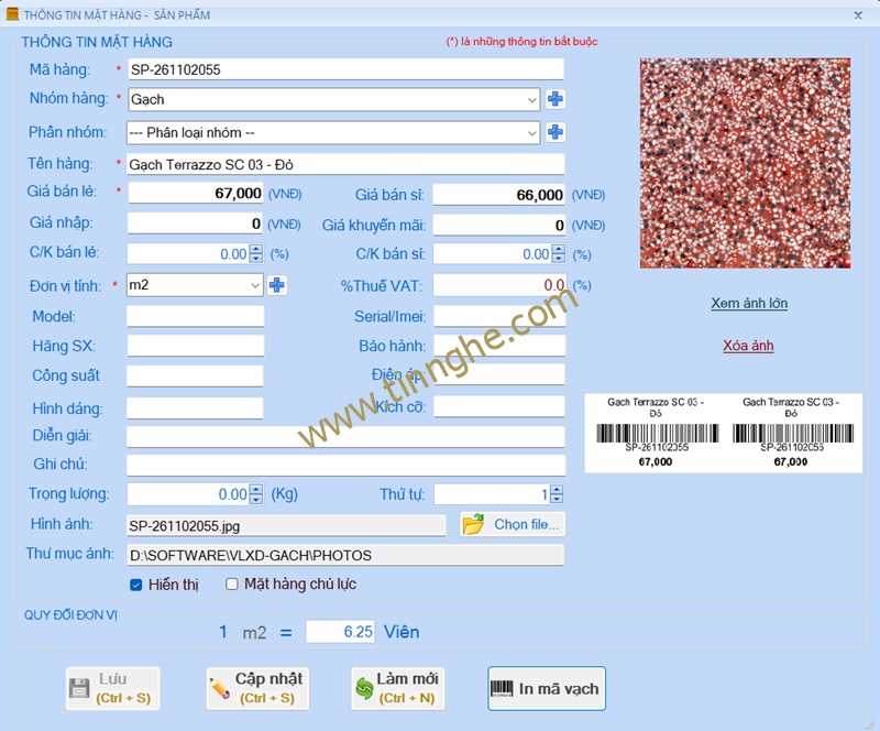 Thông tin mặt hàng chi tiết, cho phép lưu hình ảnh + in tem mã vạch
