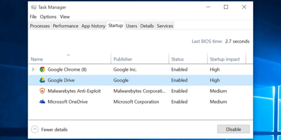 Trên Windows 8, 8,1 và 10, giờ đây đã tích hợp trình quản lý ứng dụng khởi chạy cùng Windows “Startup” trong Task Manager, người dùng có thể sử dụng để quản lý các chương trình khởi động. Nhấp chuột phải vào thanh tác vụ và chọn “Task Manager” hoặc nhấn Ctrl + Shift + Escape để khởi động nó. Nhấp vào tab Startup và vô hiệu các ứng dụng khởi động người dùng không cần. Windows sẽ giúp cho người dùng biết ứng dụng nào làm chậm quá trình khởi động nhiều nhất.