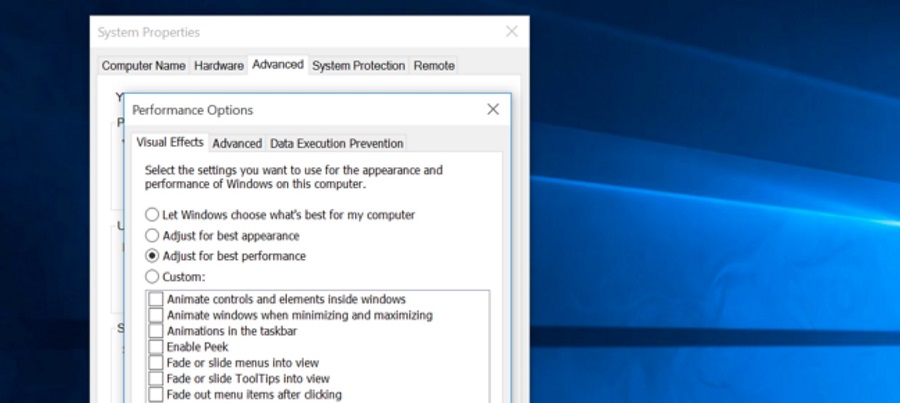Để tắt hiệu ứng hình động , nhấn Windows Key + X hoặc nhấn chuột phải vào nút Start và chọn “System“. Nhấp vào “Advanced System Settings” ở bên trái và nhấp vào nút “Settings” dưới Performance. Chọn “Adjust for best performance” trong Visual Effects để tắt tất cả hoạt ảnh hoặc chọn “Custom” và vô hiệu các hình động không cần thiết.