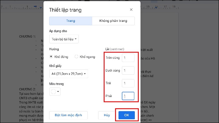- Bước 3: Cuối cùng bạn chỉ cần thiết lập căn lề giống như hình dưới đây mình làm (đưa về giá trị 1 hoặc nhỏ hơn) > rồi nhấn Ok là xong rồi nè.