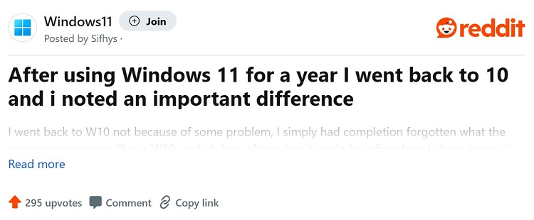 Một số người sẽ nói rằng Windows 10 mang lại cho họ hiệu suất tốt hơn Windows 11, trong khi những người khác sẽ cho biết không nhận thấy bất kỳ sự khác biệt nào. Tuy nhiên, đối với không ít người, sự khác biệt hiệu năng lớn đến mức họ chuyển sang Windows 10 và nhận thấy mọi thứ chạy mượt mà hơn. Cộng đồng Windows 11 trên Reddit có không ít chủ đề nói về việc này và có hàng trăm lượt tranh luận.