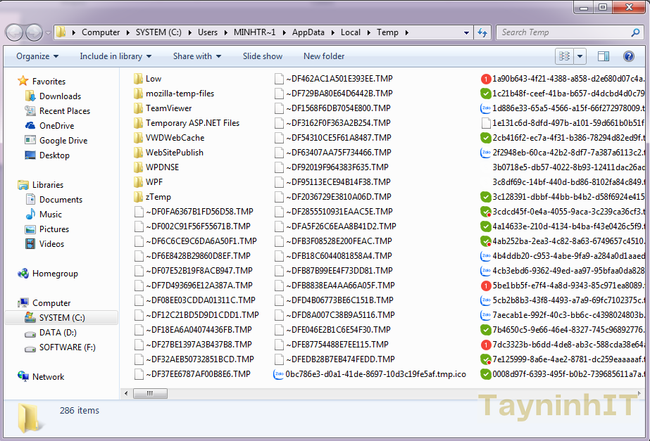 Cửa sổ thư mục Temp hiện lên, bạn thực hiện xóa toàn bộ dữ liệu trong đó. Sau khi xóa xong là bạn đã xóa toàn bộ các file tạm có trong máy tính của mình rồi.