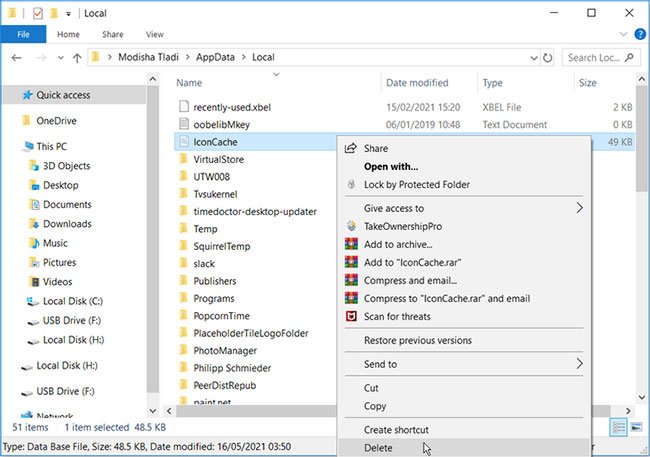 Xóa cache biểu tượng cũng có thể hữu ích. Nhưng vì file này nằm trong một thư mục ẩn, bạn sẽ phải hiển thị các file ẩn trên File Explorer.