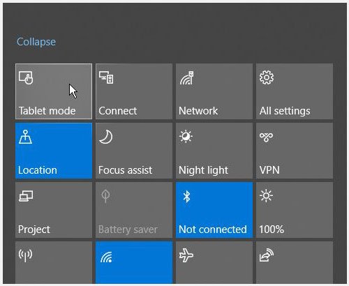 - Bước 2: Nếu tiện ích Tablet mode có màu xanh lam, điều này cho thấy rằng nó đã được bật. Nhấn vào đó để vô hiệu hóa nó.