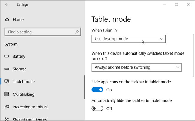 Nếu PC luôn khởi động ở Tablet mode, bạn có thể thay đổi điều này bằng cách cấu hình Windows 10 Settings của mình.