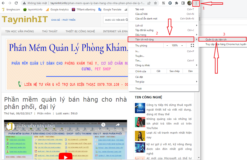 - Bước 1: Bấm vào biểu tượng 3 chấm ở góc trên bên phải giao diện trình duyệt Chrome, chọn "Tiện ích mở rộng -> Quản lý các tiện ích".