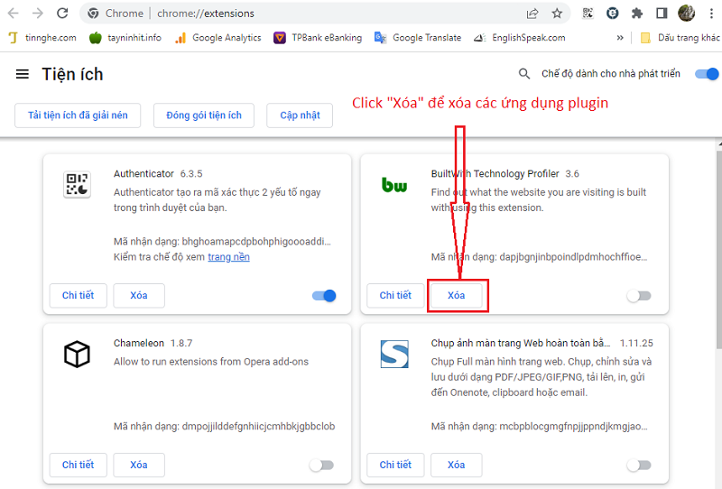 - Bước 2: Danh sách các extension đã cài đặt trên trình duyệt Chrome sẽ được liệt kê đầy đủ. Tại đây, bạn nhấn nút "Xóa" tại extension để gỡ bỏ các tiện ích mở rộng không mong muốn ra khỏi Chrome.