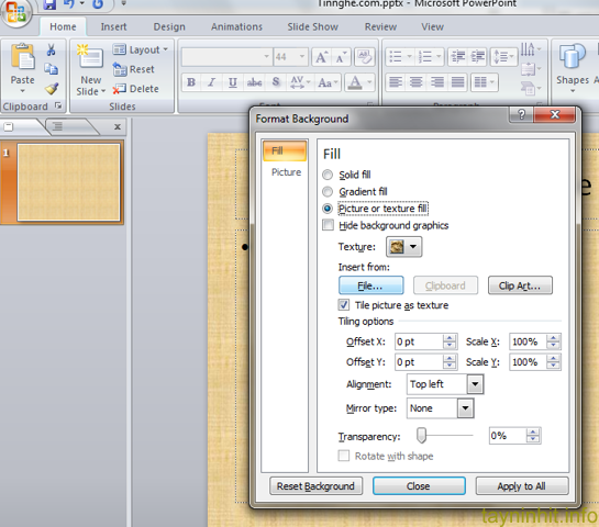Như vậy là đã hoàn thành việc đưa hình nền vào file Powerpoint để làm cho bài giảng, thuyết trình của thêm phần hấp dẫn.