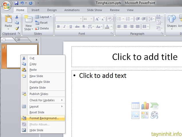 Ngoài việc làm đẹp slide Powerpoint bằng SMARTART 2007 thì để giúp Slide thêm sống động, đẹp mắt ta có thể thay đổi hình nền cho Slide đẹp hơn, sống động hơn. Sau đây chúng tôi giới thiệu đến các bạn cách thay đổi hình nền cho Slide trong Power Point 2007.