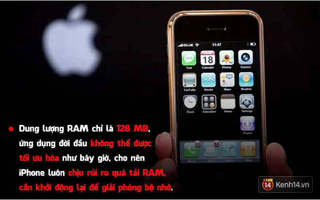 Bạn nghĩ mọi thứ vậy là xong ư? Chưa đâu, vì dung lượng RAM khi đó của iPhone chỉ là 128 MB, lại còn ứng dụng đời đầu không thể được tối ưu hóa như 10 năm sau như bây giờ, cho nên iPhone sẽ luôn chịu rủi ro quá tải RAM và cần phải... khởi động lại để giải phóng bộ nhớ.