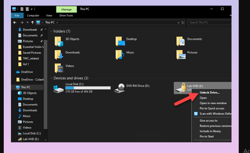 - Bước 1: Truy cập This PC → Nhấp chuột vào ổ cứng được khóa Bitlocker trong Windows Explorer → Click chọn Unlock Drive.