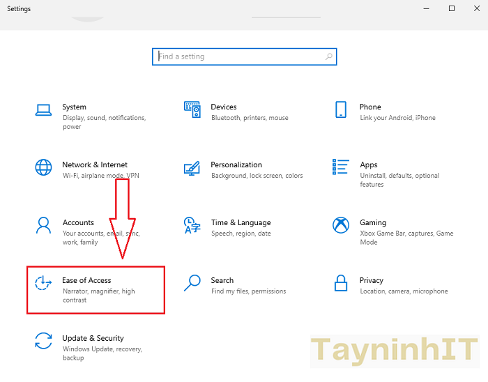 - Bước 1: Vào Start > Setting > Chọn Ease of Access.