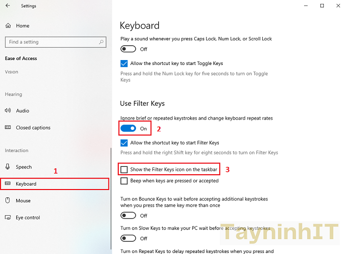 - Bước 2: Chọn Keyboard > Tại Use Filter Keys, bật On ở mục Ignore brief or repeated keystrokes and change keyboard repeat rates.