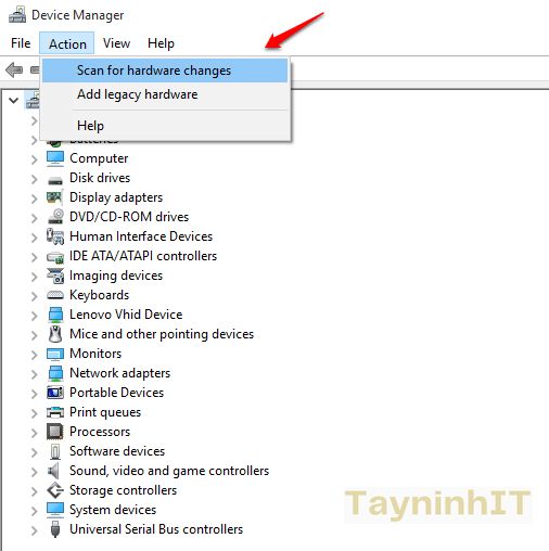 – Bước 5: Hoặc cách khác là click chọn thẻ Action, từ menu dropdown bạn click chọn tùy chọn Scan for hardware changes.
