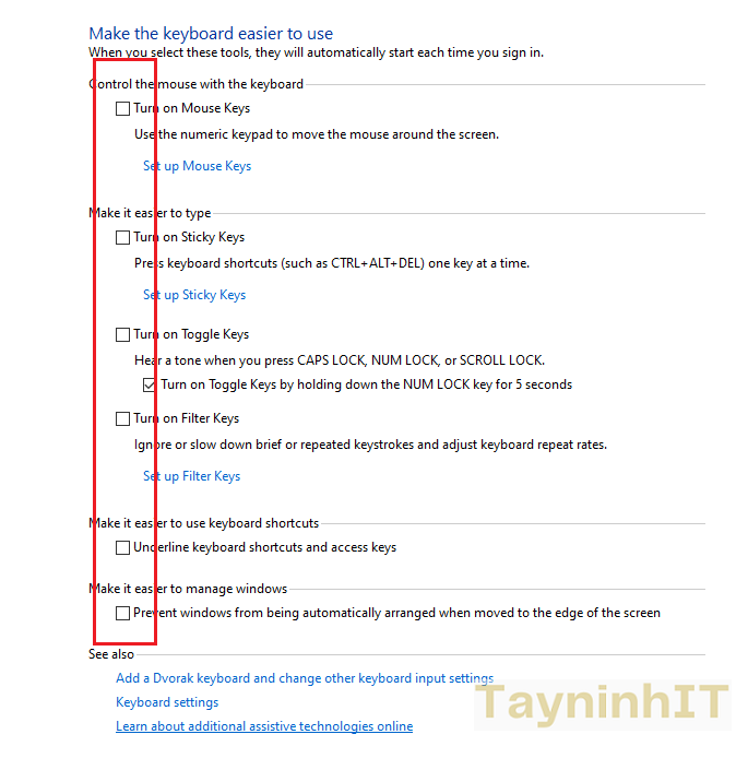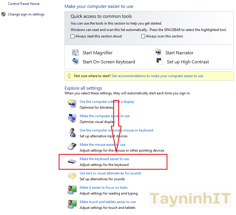- Bước 3: Ở cửa sổ “Ease of Access Center”, bạn chọn Make the keyboard easier to use