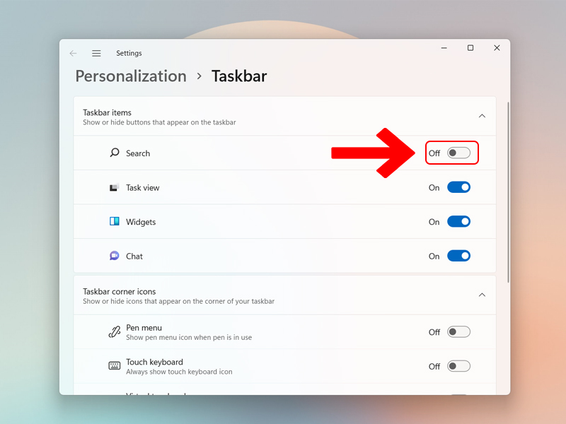 - Bước 2: Tại mục Taskbar items chuyển trạng thái của biểu nút Search thành Off.