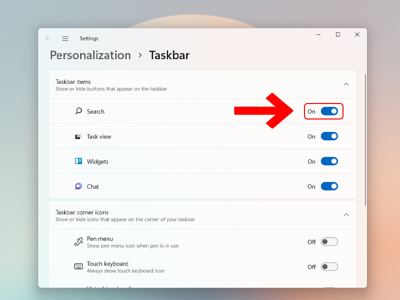 - Bước 2: Tại mục Taskbar items chuyển trạng thái của biểu nút Search thành On.