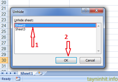 - Bước 3: Chọn Sheet Excel cần bỏ ẩn sau đó nhấn OK