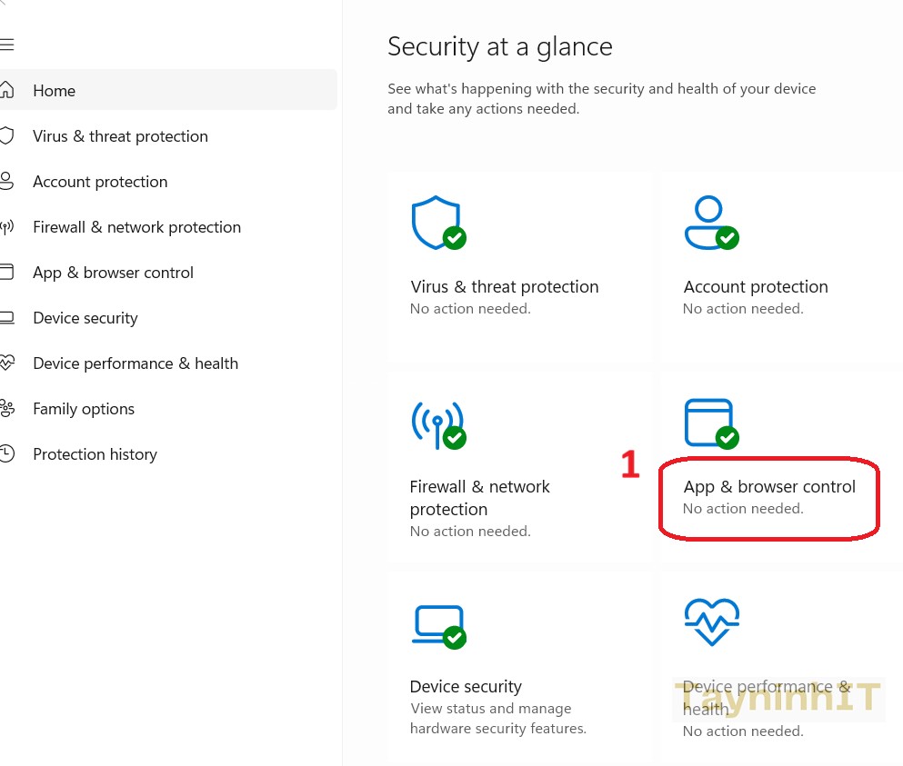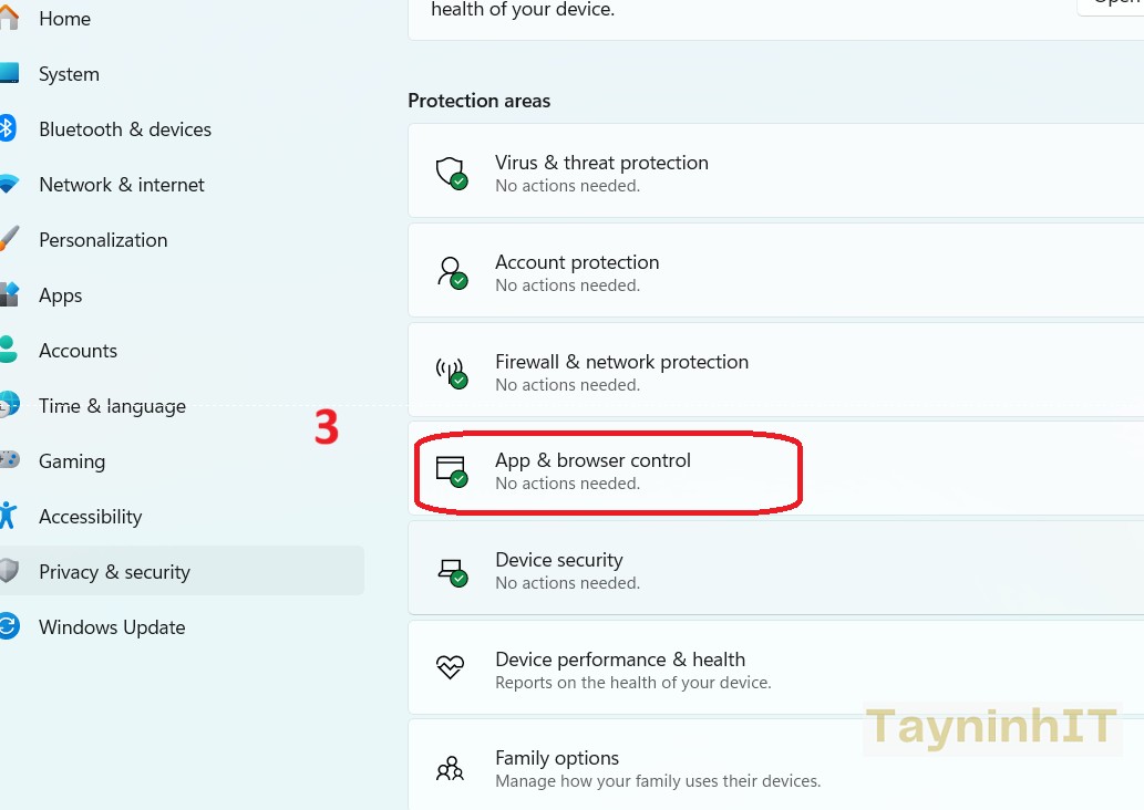 - Bước 2: Chúng ta chọn App & browser control để điều chỉnh chế độ cài đặt cho ứng dụng trên Windows 11.