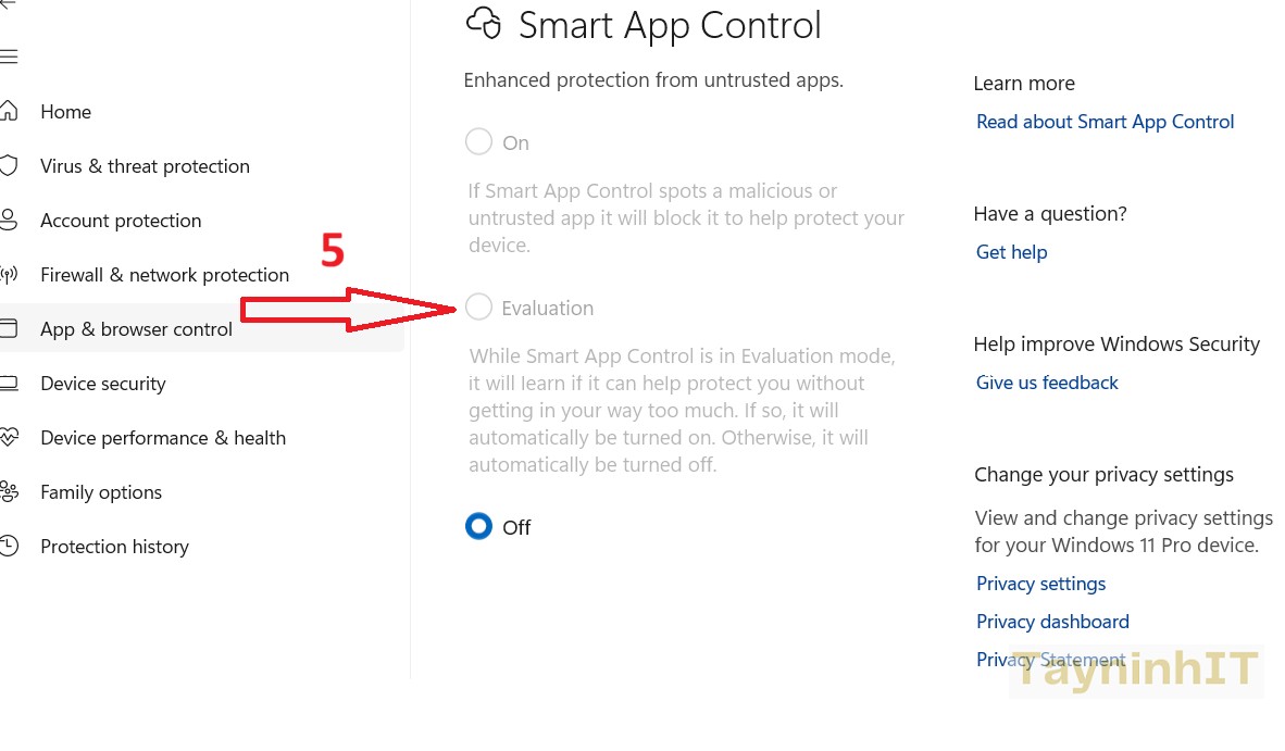 - Bước 4: Phần thiết lập tính năng bảo mật Smart App Control Windows 11 gồm có các tùy chọn khác nhau, chúng ta chọn Evaluation để kích hoạt.