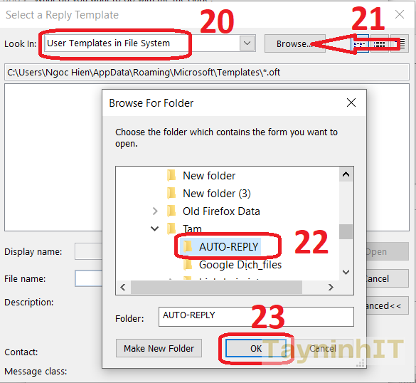 - Bước 11: Tại mục Look in chọn User Template in File System > chọn Browse... Rồi tìm đến vị trí Folder vừa tạo lúc nãy > nhấn OK để đưa file Auto Reply vào Outlook.