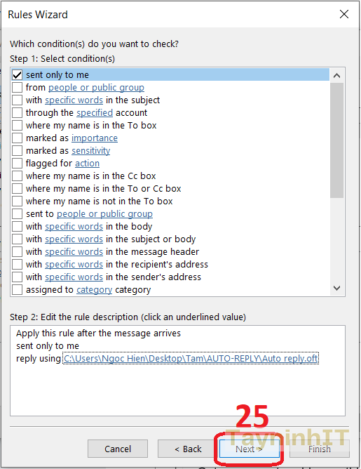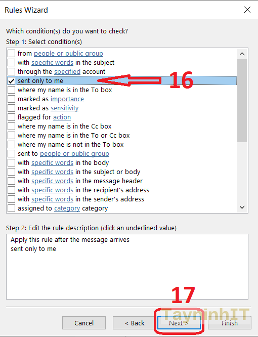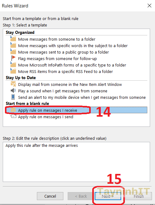 - Bước 8: Sau đó bạn nhấn chọn Apply rule on message I receive > Next tại hộp thoại Rules Wizard để tiếp tục.