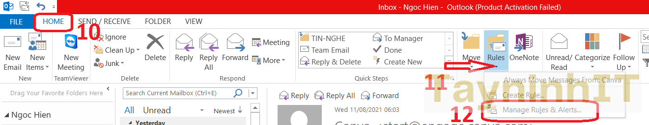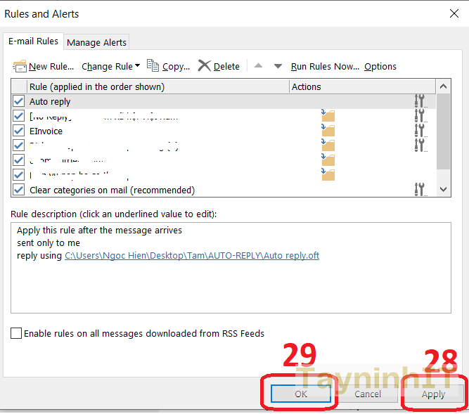 - Bước 6: Khi lưu file Auto Reply hoàn tất. Mở tab Home > Rules > Manage Rules & Alerts…
