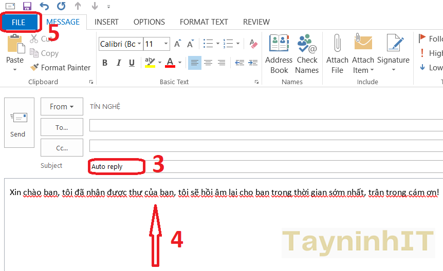 - Bước 2: Tại tab Message, bạn đặt chủ đề Subject là Auto Reply, và nhập nội dung trả lời tự động > click vào File.
