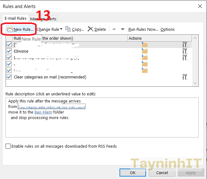 - Bước 7: Hộp thoại Rules and Alerts xuất hiện >Tab E-mail Rules > New Rule.