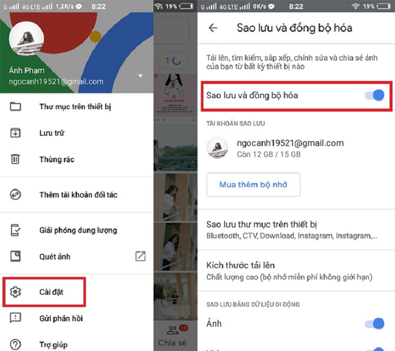 - Bước 3: Tại giao diện chính của ứng dụng, hãy nhấn chọn biểu tượng 3 dấu gạch ngang ở góc trái phía trên màn hình và chọn Cài đặt > Click chọn Sao lưu và đồng bộ hóa > bạn chỉ cần chuyển thanh này sang trạng thái ON là kết thúc quá trình.