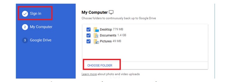 - Bước 2: Sau khi hoàn tất bước 1, bạn đăng nhập tài khoản Google của bạn trên Google Backup and Sync > Nhấn chọn Choose Photos.