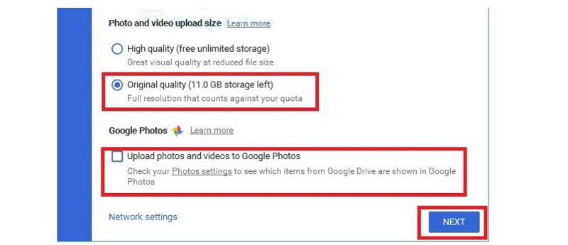 Nhấn chọn ô thông tin Upload photos and videos to Google Photos > Next để bắt đầu sao lưu.