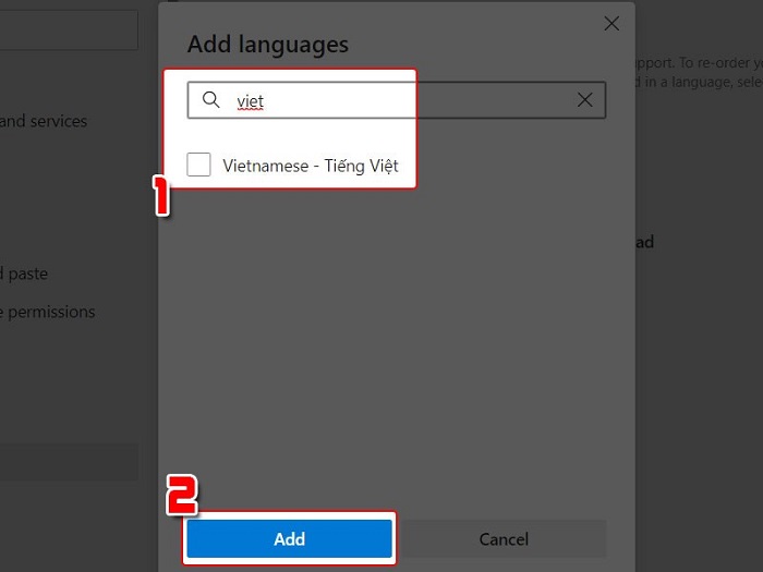 - Bước 5: Nhập vào thanh ngang tìm kiếm Vietnamese – Tiếng Việt. Nhấn tiếp vào nút Add (thêm) để thêm ngôn ngữ.