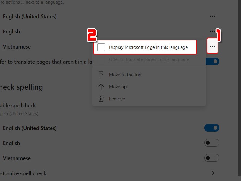 - Bước 6: Nhấn vào biểu tượng 3 dấu chấm rồi chọn Display Microsoft Edge in this language (Hiển thị Microsoft Edge bằng ngôn ngữ này).