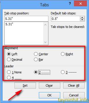 Bước 4: Tại đây bạn có thể lựa chọn các kiểu của Tab sau rồi chọn Set và chọn tiếp OK