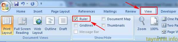 Mở Microsoft Word ra nếu thanh Ruler đã được bật. Nếu chưa bật, các bạn vào menu View -> Tích vào ô Ruler