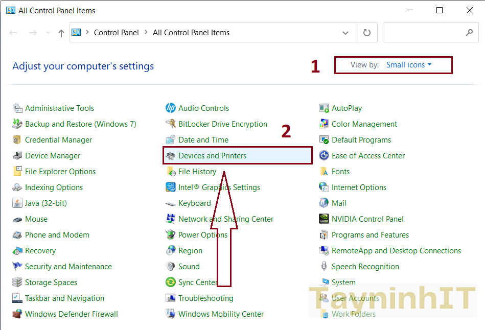 - Bước 2: Tại Control Panel chọn "Devices and Printers"