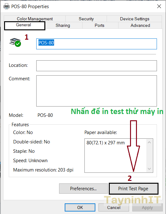 - Bước 6: Sau khi chọn đúng cổng kết nối cho máy in hóa đơn, ta quay trở lại tab “General” và tiến hành in thử bằng cách click “Print Test Page”. Lúc này máy in hóa đơn sẽ in ra 1 trang test cho bạn biết rằng đã cài đặt thành công.