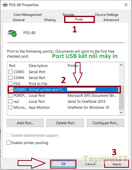 - Bước 4: Tại tab “Port” ta tìm đến cổng mà máy in hóa đơn kết nối đã biết trong bước kiểm tra port ở khi cài đặt. Tick vào ô trước port đó, có nhiều loại kết nối khác nhau cho từng nhu cầu sử dụng máy(Đối với máy mình là USB003). Sau đó click “Apply” để xác nhận việc thay đổi tạm thời.
