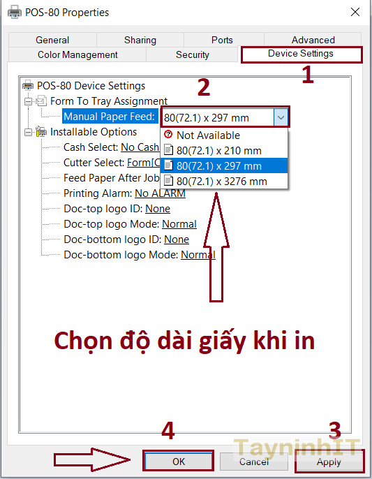 - Bước 5: Tùy chỉnh khổ giấy in bill, vào tab "Device Settings", tại mục "Manual Paper Feed" các bạn chọn lại kích thước khổ giấy in mong muống tùy theo nhu cầu, thông thường chọn khổ lớn nhất. (ở đây là 80x3276 mm)