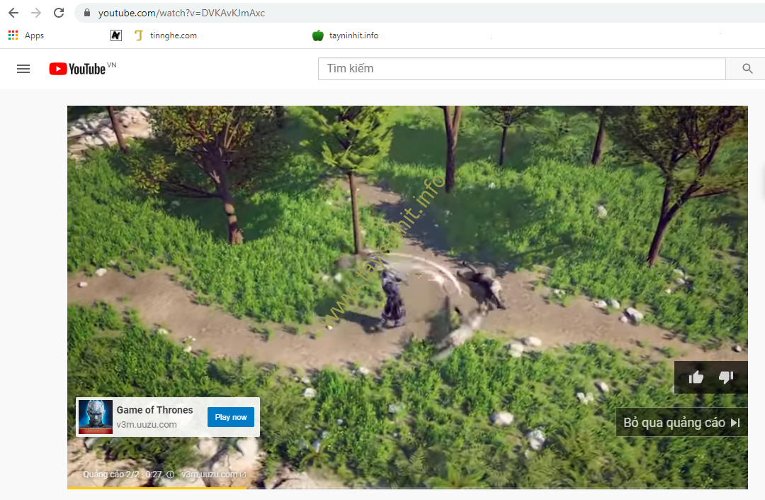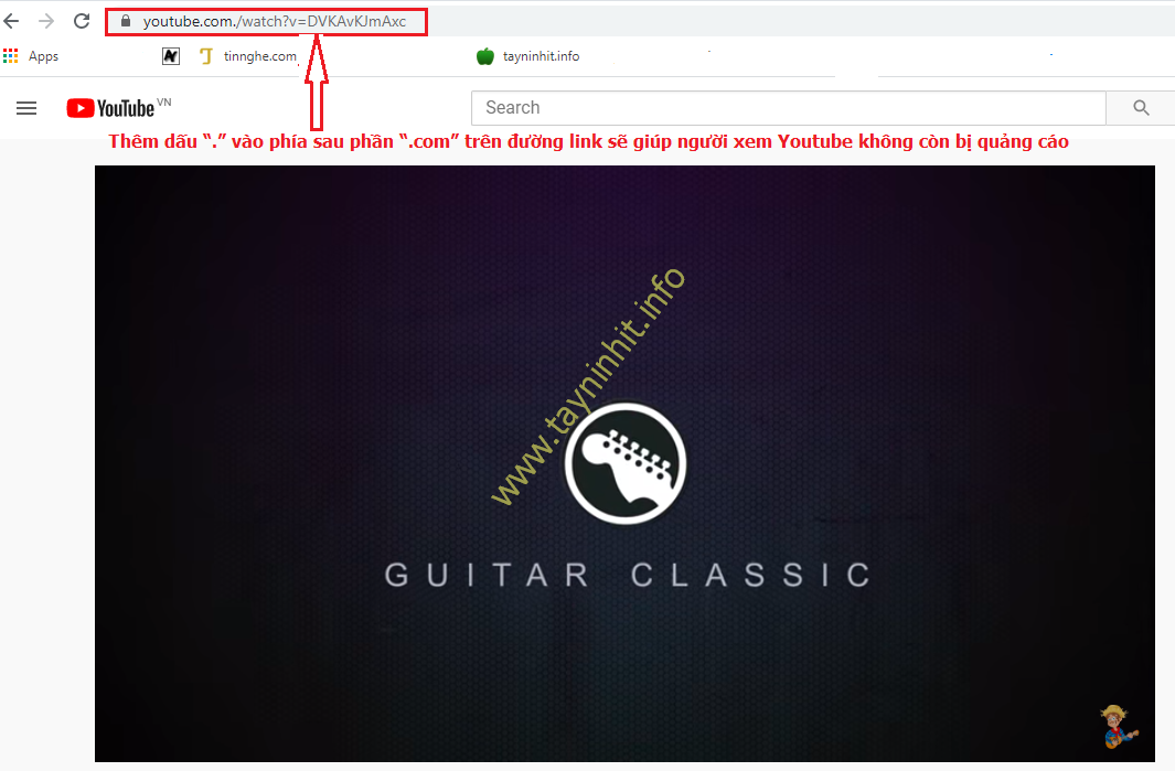Chẳng hạn, nếu video trên Youtube bạn đang xem có đường link "https://www.youtube.com/watch?v=DVKAvKJmAxc" thì bạn cần sửa đường link này trên trình duyệt web thành "https://www.youtube.com./watch?v=DVKAvKJmAxc" (thêm dấu “.” vào phía sau phần “.com”) rồi nhấn nút Enter. Bây giờ, đoạn video Youtube sẽ được phát mà không hề có sự xuất hiện của bất kỳ nội dung quảng cáo nào.