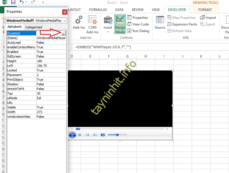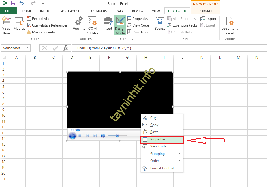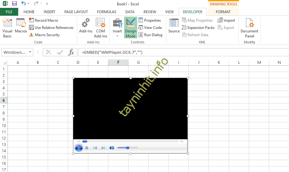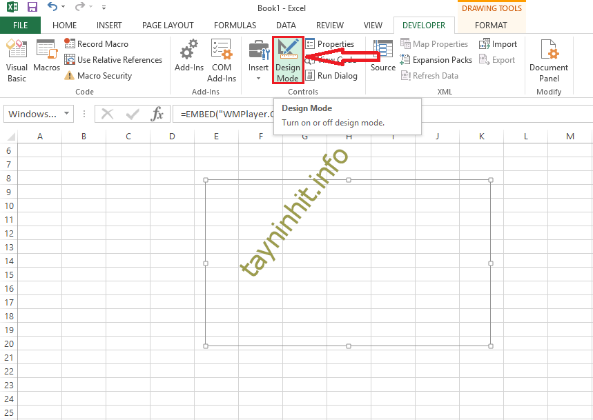 - Bước 5: Tiếp đến người dùng nhấn vào Design Mode để kích hoạt phát video trên Excel bằng công cụ Windows Media Player.