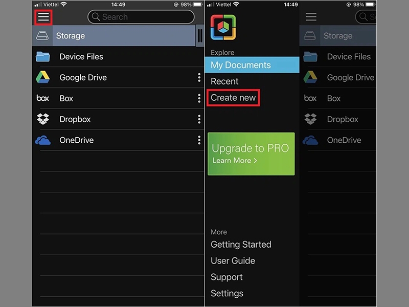 Bước 2: Mở ứng dụng, nhấn vào biểu tượng 3 dấu gạch ngang ở góc trên bên trái màn hình > Chọn Create new.