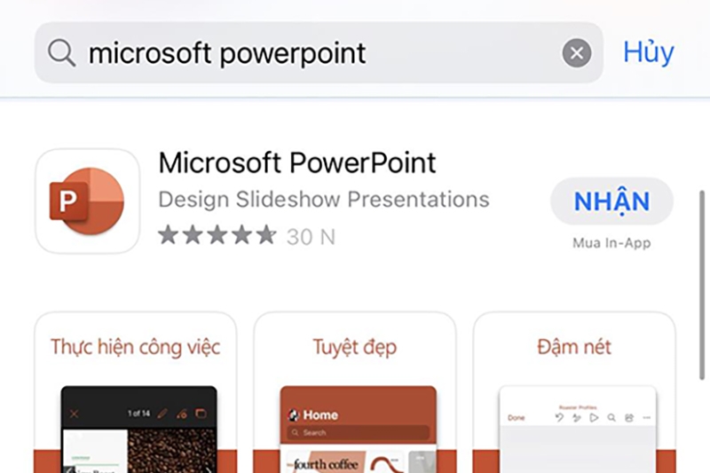Bước 1: Trước tiên bạn cần tải app về điện thoại bằng cách truy cập CH Play hoặc App Store sau đó tìm từ khóa Microsoft PowerPoint > Nhấn Tải/Nhận để download ứng dụng.