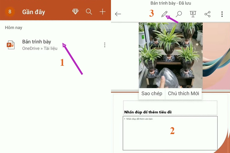 Bước 2: Sau khi tải xong, bạn mở ứng dụng > Vào mục Bản trình bày > Click vào slide muốn chèn video > Click vào mục chỉnh sửa (biểu tượng hình cây bút).
