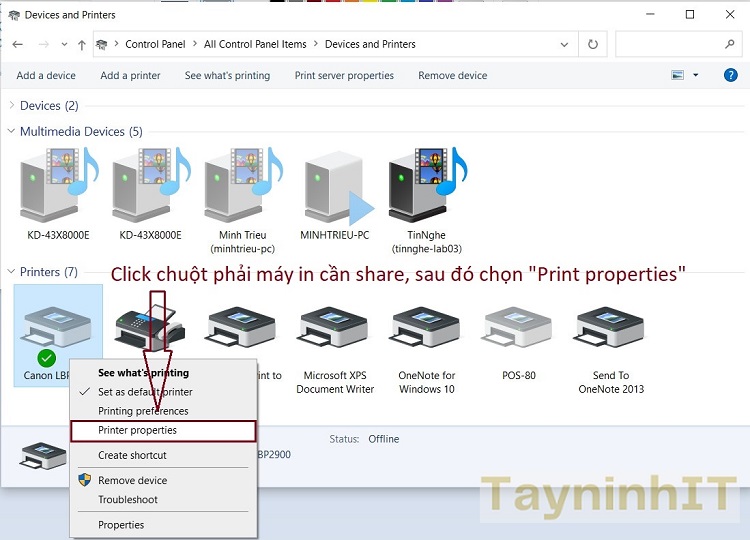 - Bước 3: Trên cửa sửa "Device and Printers" này bạn sẽ thấy những thiết bị máy in mà bạn đã và đang kết nối ở cửa sổ mới đó. Click chuột phải vào máy in đang kết nối với máy tính, chọn mục “Set as default printer” để cài đặt máy in này làm mặc định. Sau đó, lại nhấp chuột phải và chọn vào mục “Printer properties” để mở hộp thoại chia sẻ.